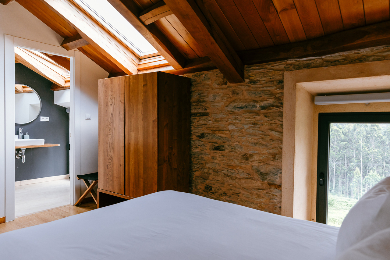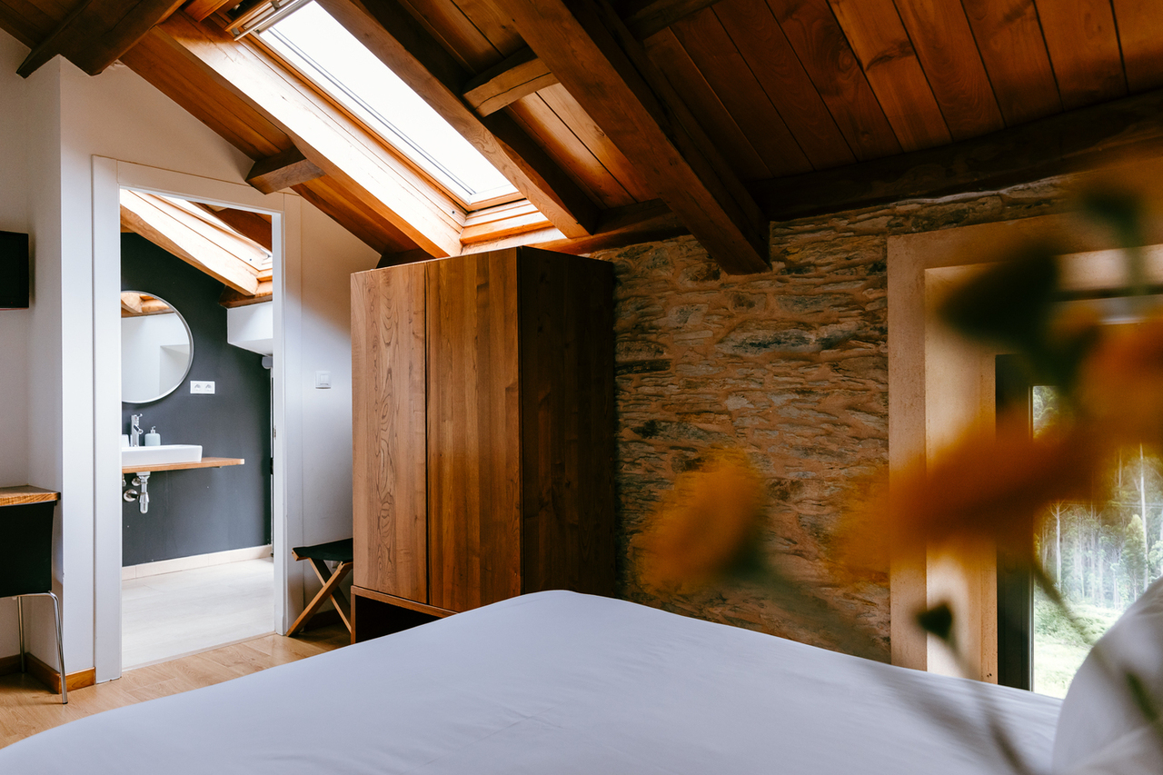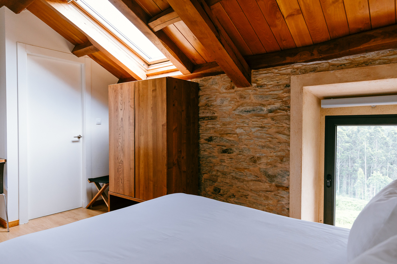 • Dispone de techos muy altos de madera , con las tijeras y vigas de castaño originales restauradas.