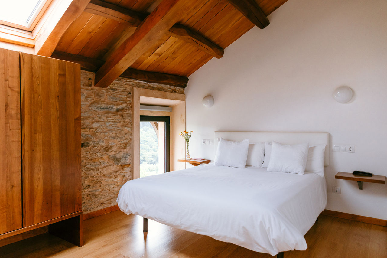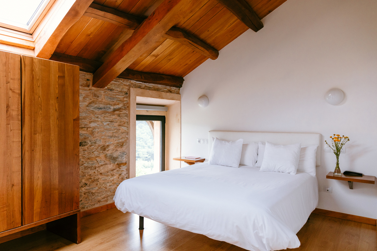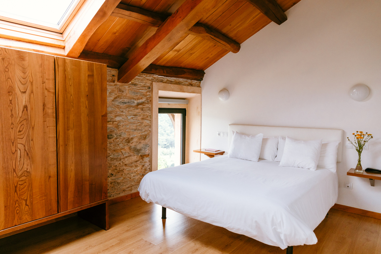 • Dispone de techos muy altos de madera , con las tijeras y vigas de castaño originales restauradas.